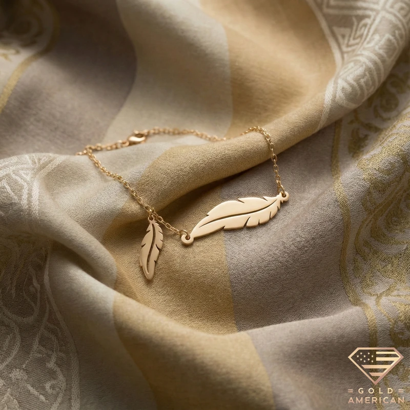Adorn your wrist with the delicate beauty of the Golden Twin Risha Bracelet. Featuring two intricately detailed feather charms on a fine gold chain, this Arabic-inspired piece offers a touch of light, airy elegance.