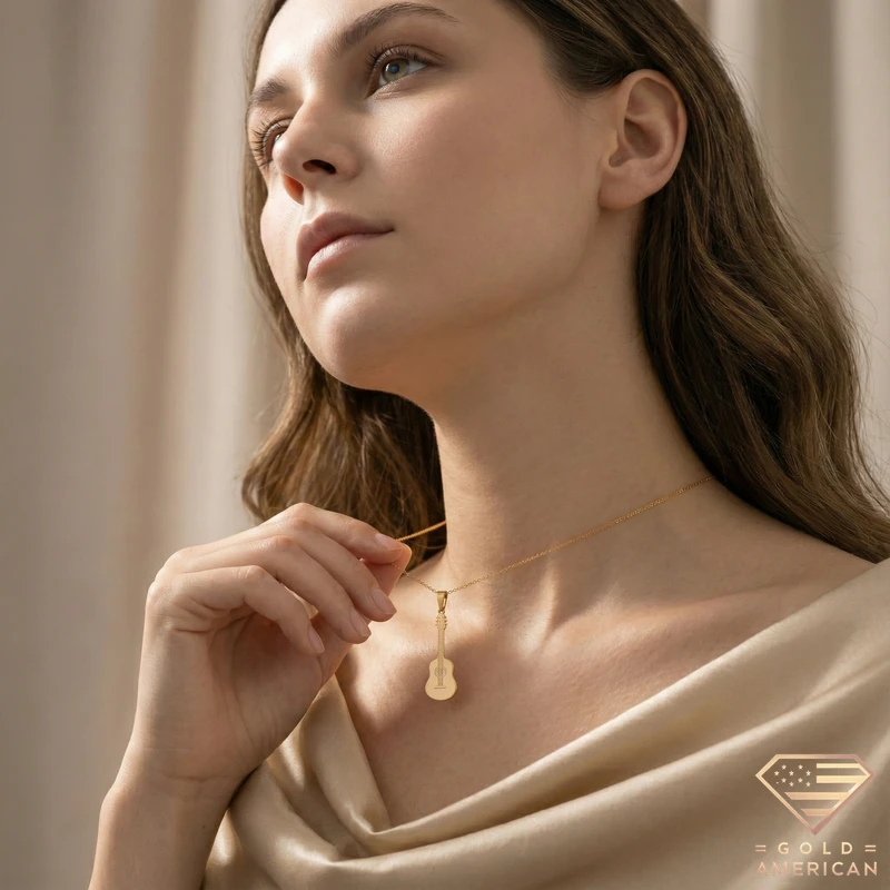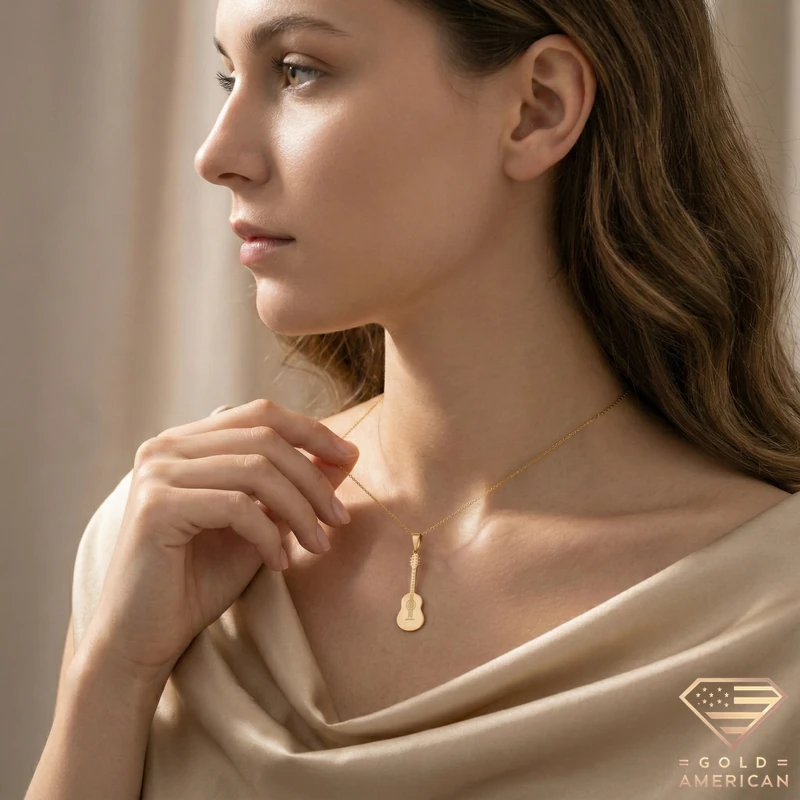 Celebrate your love for music with this solid 14k gold guitar pendant. A delicate, high-polish piece designed for everyday wear and lasting quality.