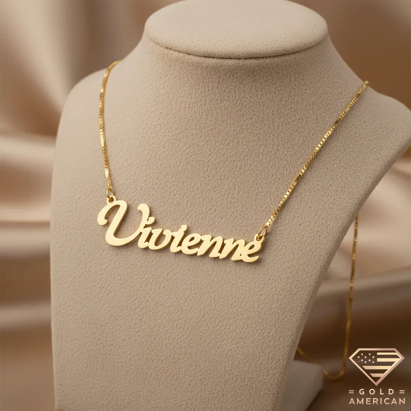 Enchanting and whimsical, Charming Gold Name Pendant is a personal treasure to possess. Illuminating delicately on the neck, holding the name you require, this gold piece is ready to be easily purchased online.