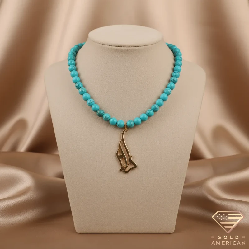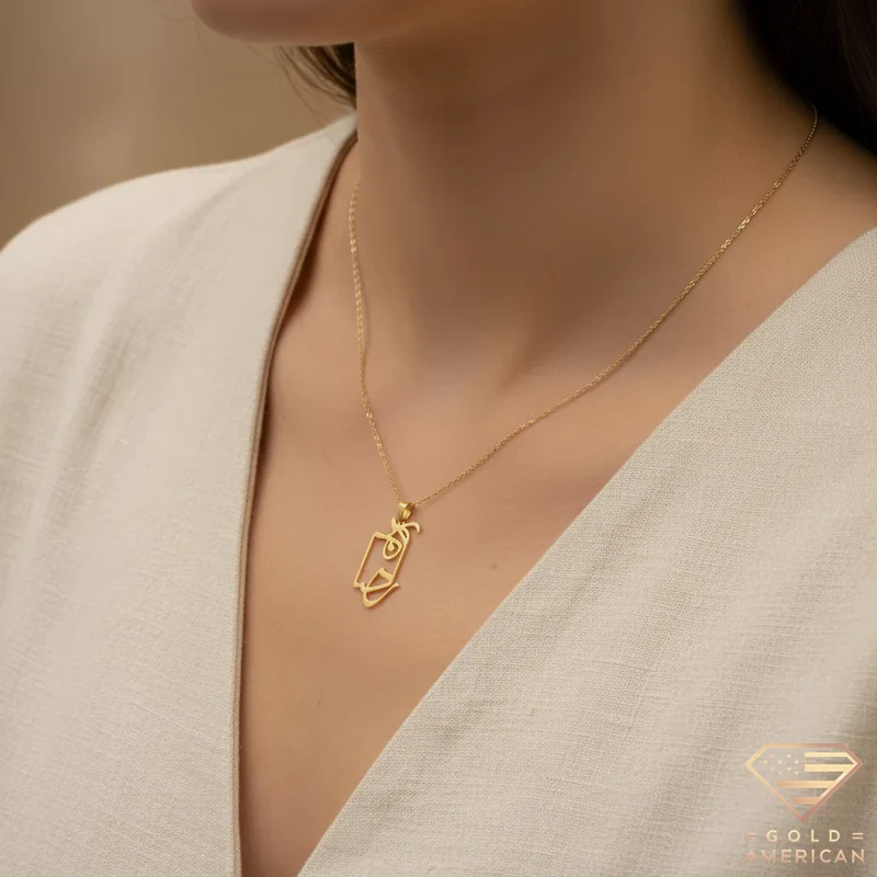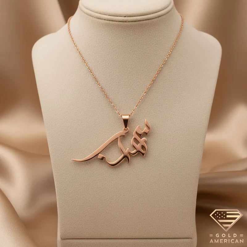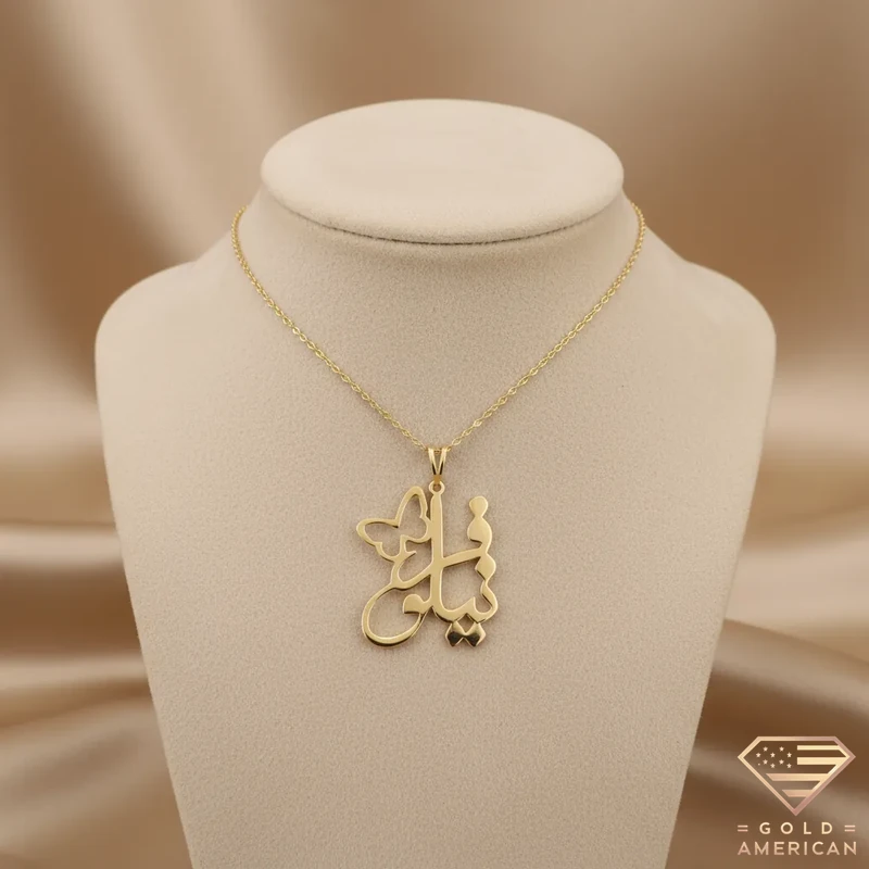 Diwani Arabic Gold Name Pendant, customizable and elegant, is a flowy script in Arabic for those who desire unique styles. This piece shows your, or your loved-one’s, signature in an artistic way, available online.