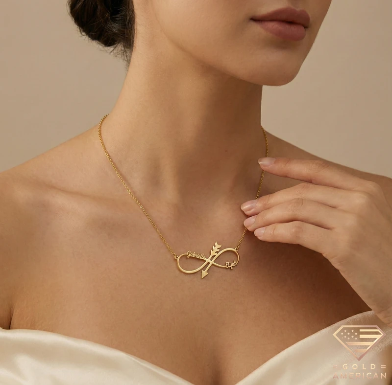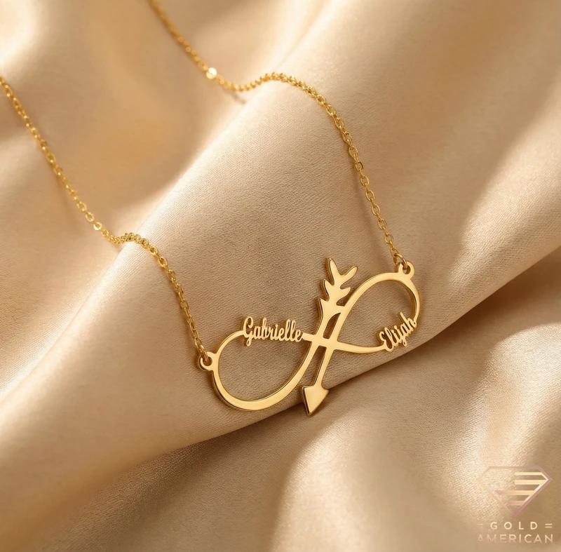 Infinity Arrow Custom Name Necklace, fully customizable, is a Buston-made piece available online, perfect as a gift to show love and commitment.
