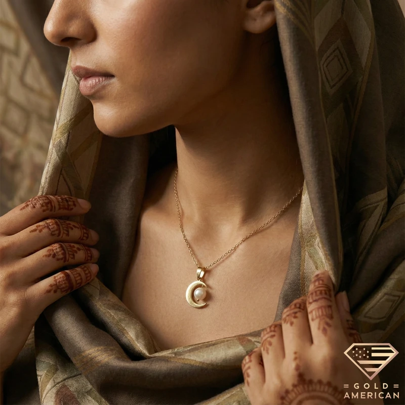 The customizable Qamar Gold Necklace, giving you the option of choosing the material, color, and chain and stone, is an Arabic vibed piece perfect for a gift.