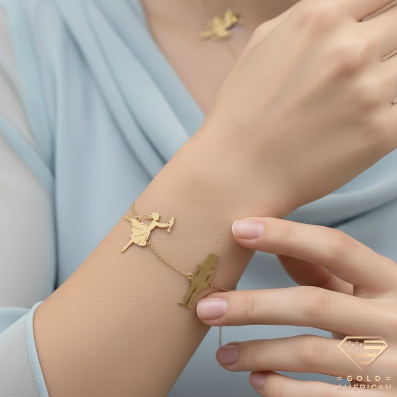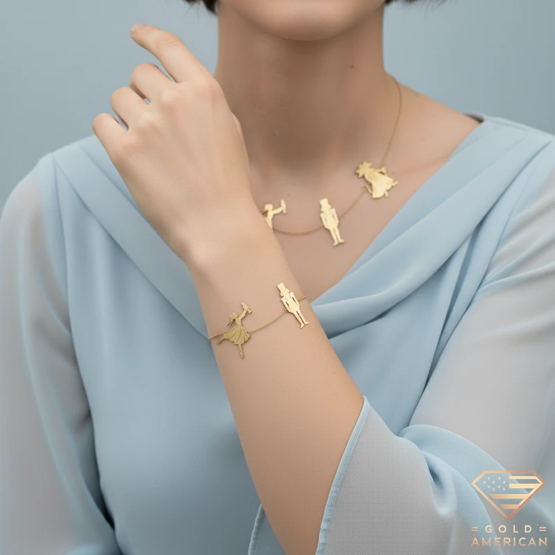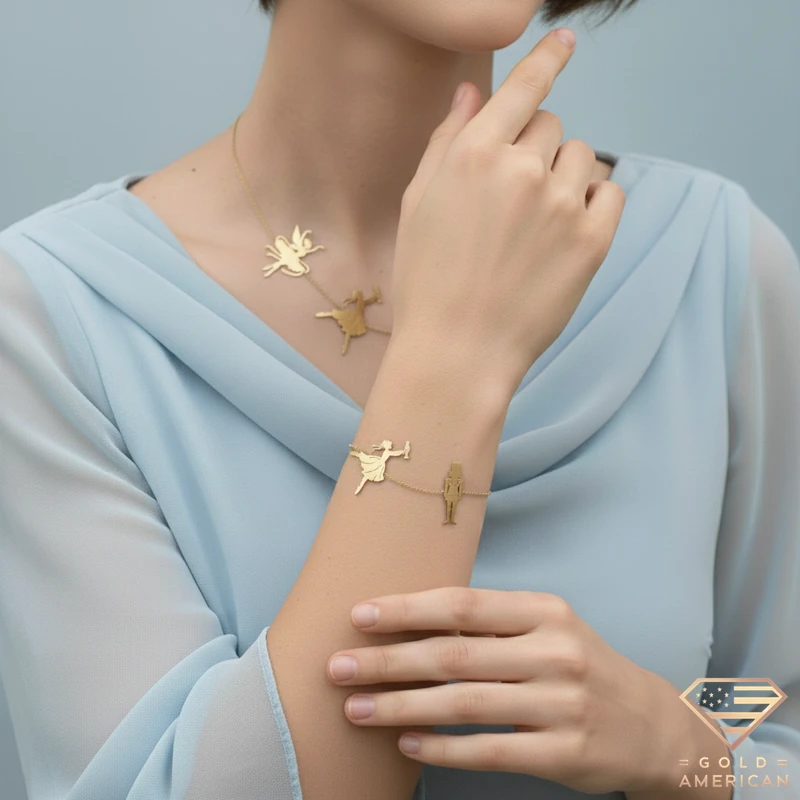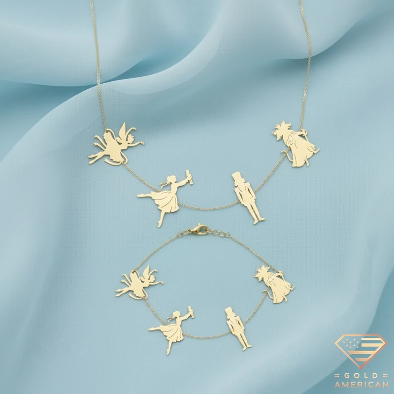 Shining and delicate, The Nutcracker Gold Set consists of a necklace and a bracelet, with the main characters of the tale; Clara, the nutcracker prince, the sugar plum fairy, and the mouse king.